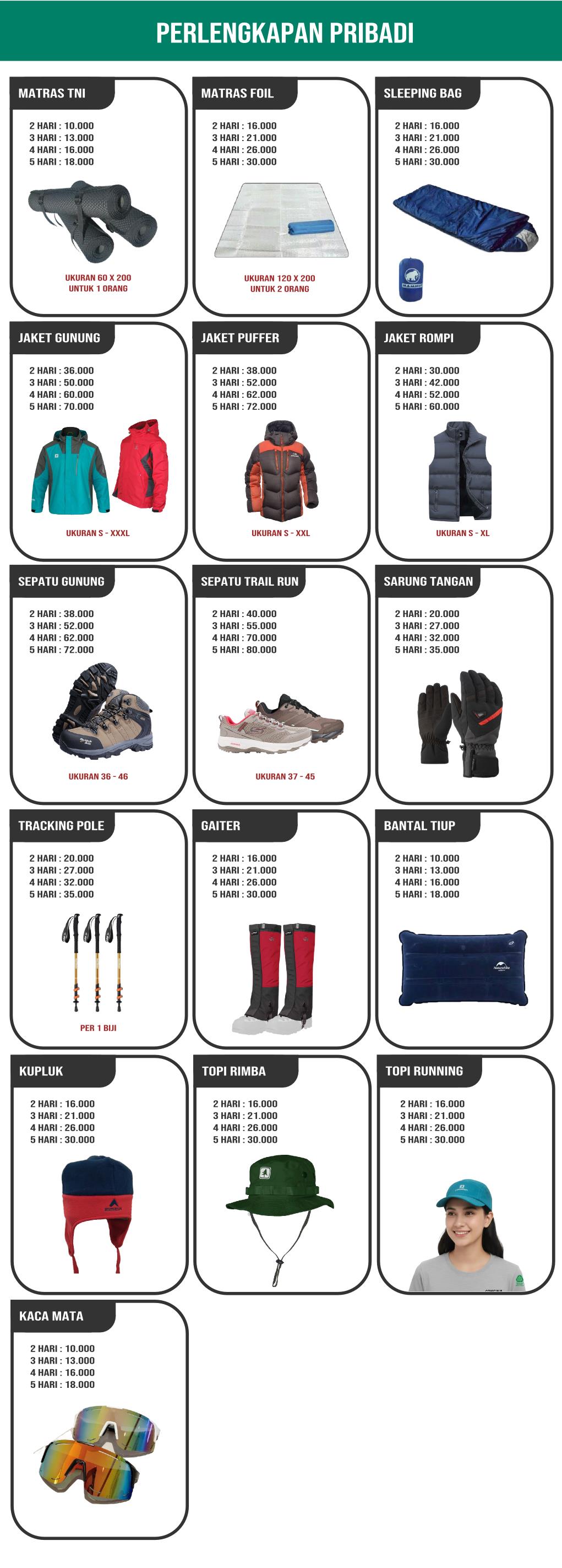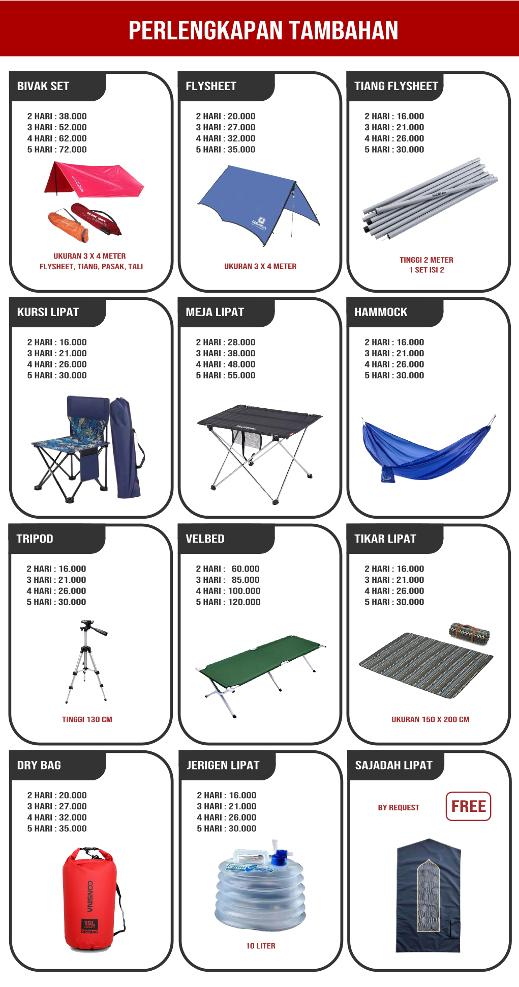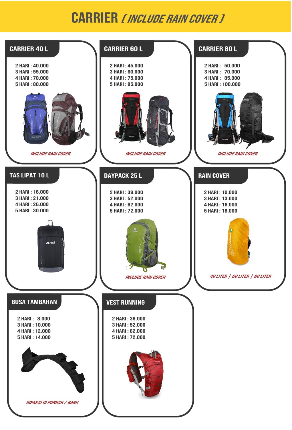 - Harga di pricelist terhitung mulai 2 hari sewa. Contoh diambil jumat kembali minggu, maka terhitung 2 hari sewa.